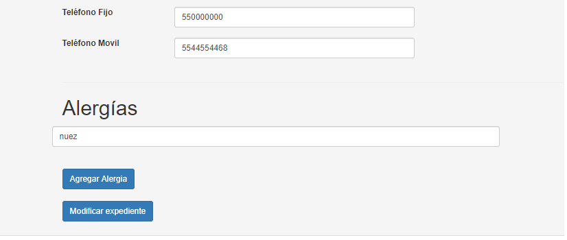 Le agregamos una alergia porque hasta donde yo se no pueden curar por eso le puse readonly para que no sea modificadas y posteriormente presionamos Modificar expediente